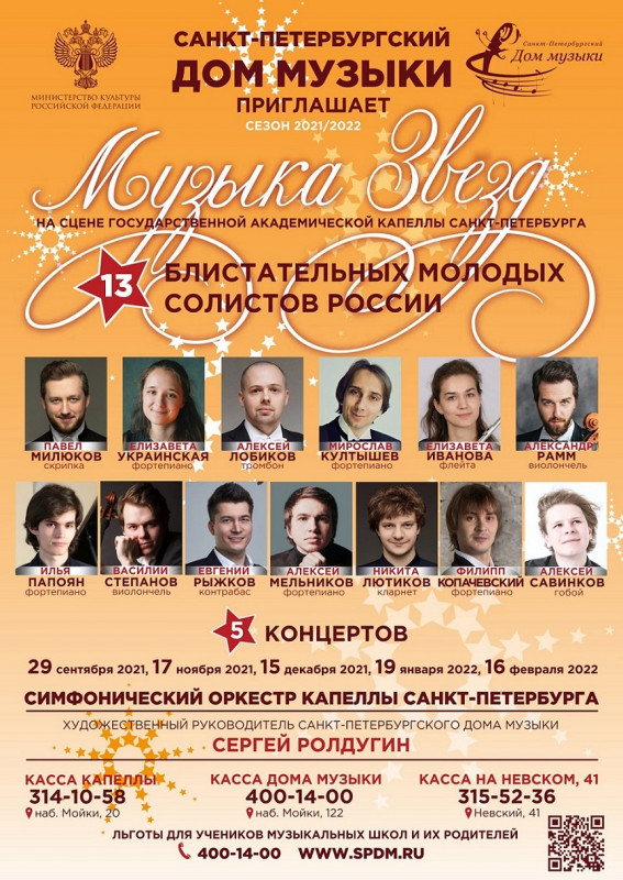 «Музыка звезд» – цикл выступлений молодых звёзд России, солистов Санкт-Петербургского Дома музыки на сцене Капеллы Санкт-Петербурга (Мойка, 20). С сентября по февраль 2021-2022 петербургскую публику ждет 5 концертных программ, где с оркестром выступят 13 солистов Дома музыки — молодые музыканты и признанные исполнители. Владельцев абонемента ждёт настоящее музыкальное путешествие: фортепианные концерты Моцарта, Бетховена, Шопена, редкие сочинения Швеции, Франции и Германии для духовых, а также богатое русское наследие рубежа 19-20 веков – Скрябин, Прокофьев, Рахманинов и многое другое.